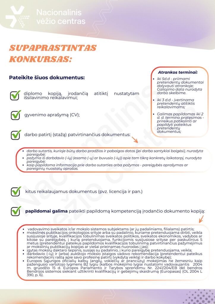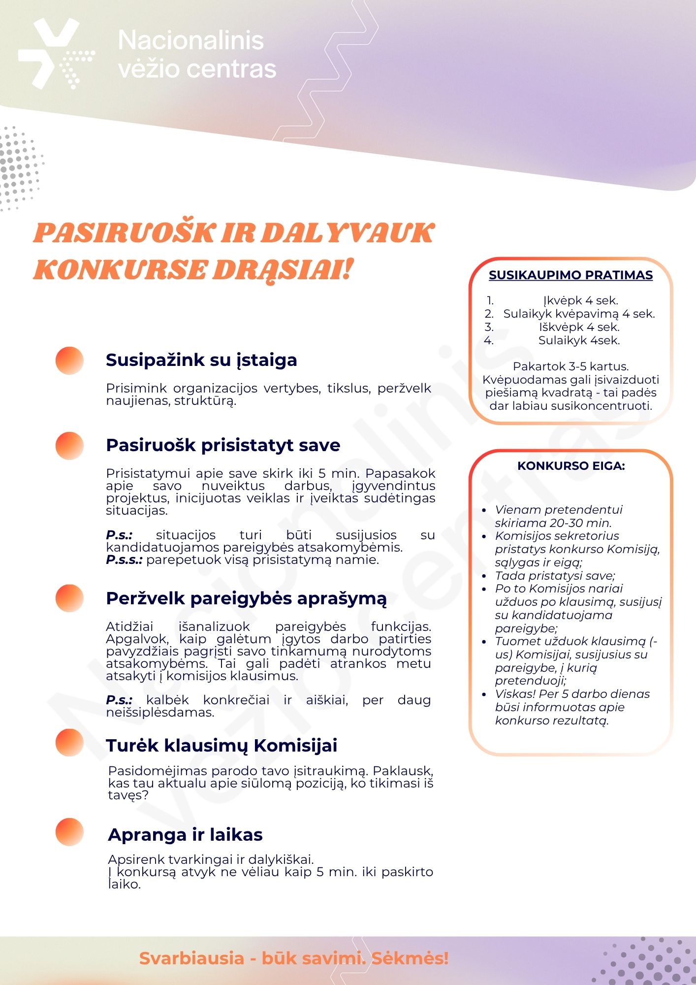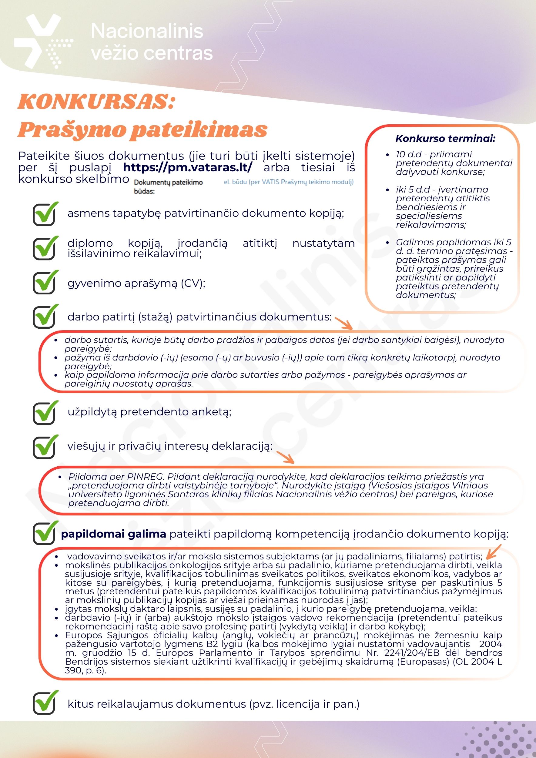 *Pretendentas, teikdamas dokumentus, sutinka, kad jo asmeniniai duomenys bus administruojami Bendrojo duomenų apsaugos reglamento nustatyta tvarka ir saugomi VšĮ Vilniaus universiteto ligoninės Santaros klinikų filialo Nacionalinio vėžio centro Personalo valdymo skyriaus atsakingo darbuotojo. Konfidencialumą garantuojame.