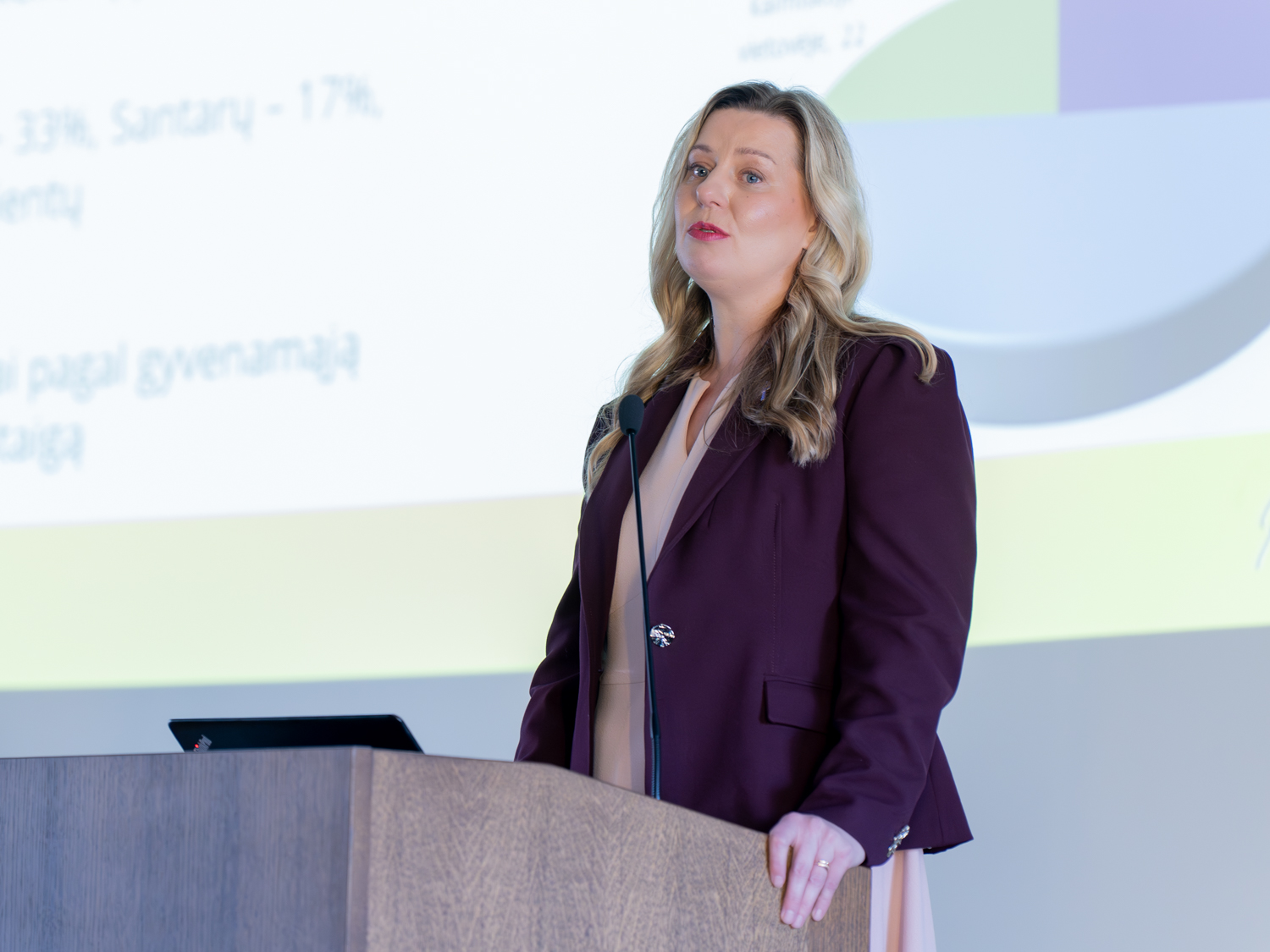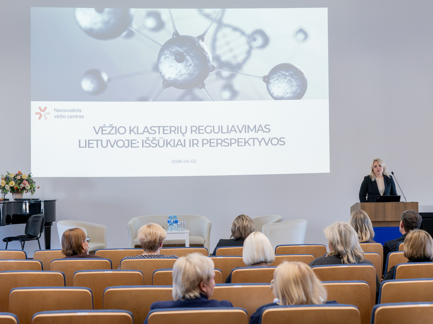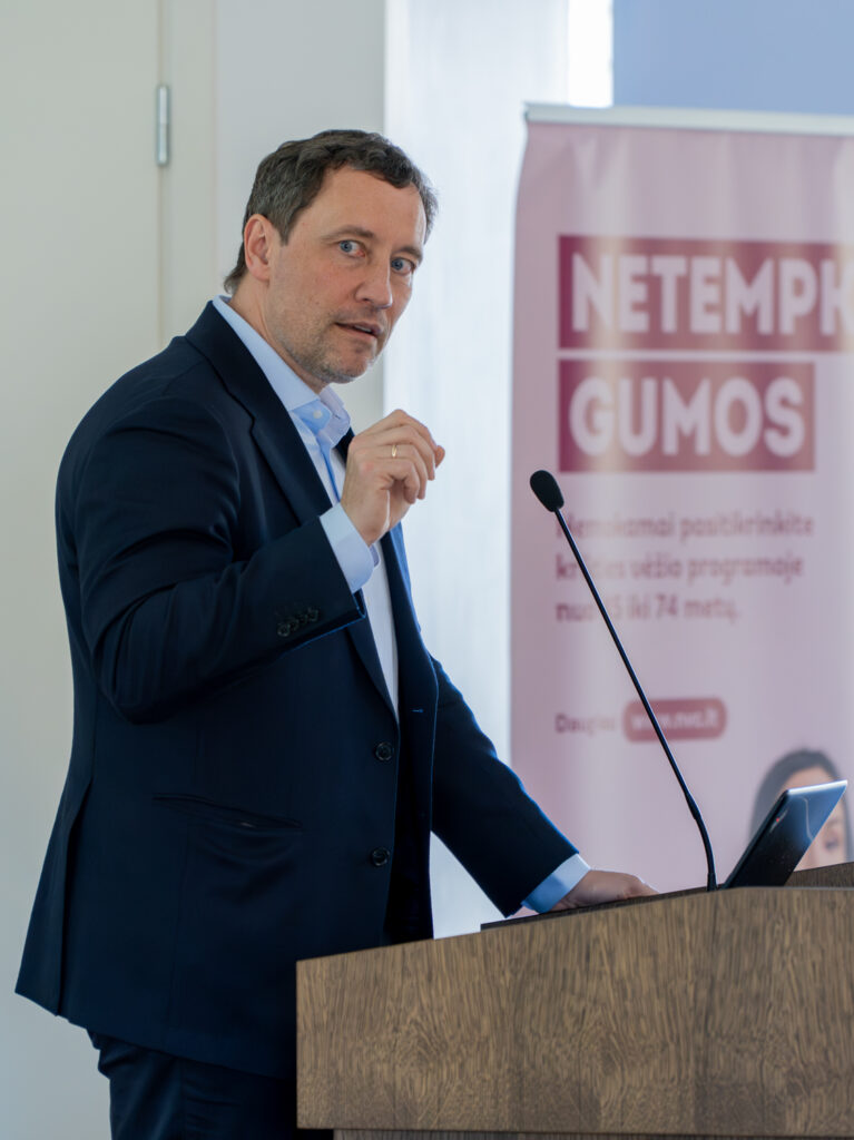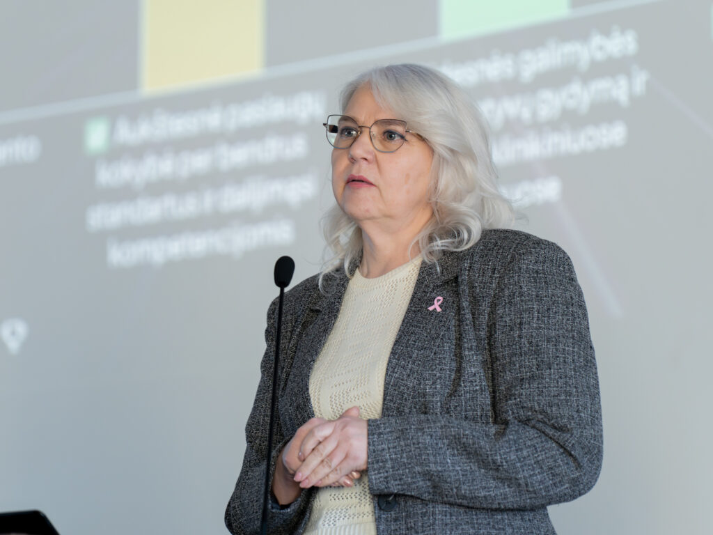 Nacionalinio vėžio centro direktoriaus pavaduotoja administravimui Vilma Srogė pristatė onkoklasterio reguliavimą Lietuvoje. „Mums visiems kyla pagrindinis klausimas – ar turime onkologijos klasterį kaip sistemą, ar turime tik atskirus tarpusavyje susijusius elementus? Kaip mūsų įstaigos turi veikti, kokios yra mūsų atsakomybės, funkcijos užtikrinant sklandų efektyvų paciento kelią šiame sudėtingame paciento gyvenimo etape? Lietuvoje onkologinių ligų našta yra labai didelė, kadangi vėžys yra viena pagrindinių mirties priežasčių mūsų šalyje. Todėl turi būti sukurta efektyvi, koordinuota sveikatos sistema, kuri užtikrintų visapusišką paciento priežiūrą. Viena esminių priemonių šiam tikslui pasiekti yra onkologijos klasteriai, kurie leidžia užtikrinti integruotą, tinkamą paciento kelio koordinavimą ir kompleksinę reikiamą onkologinę pagalbą,“ – kalbėjo V. Srogė.