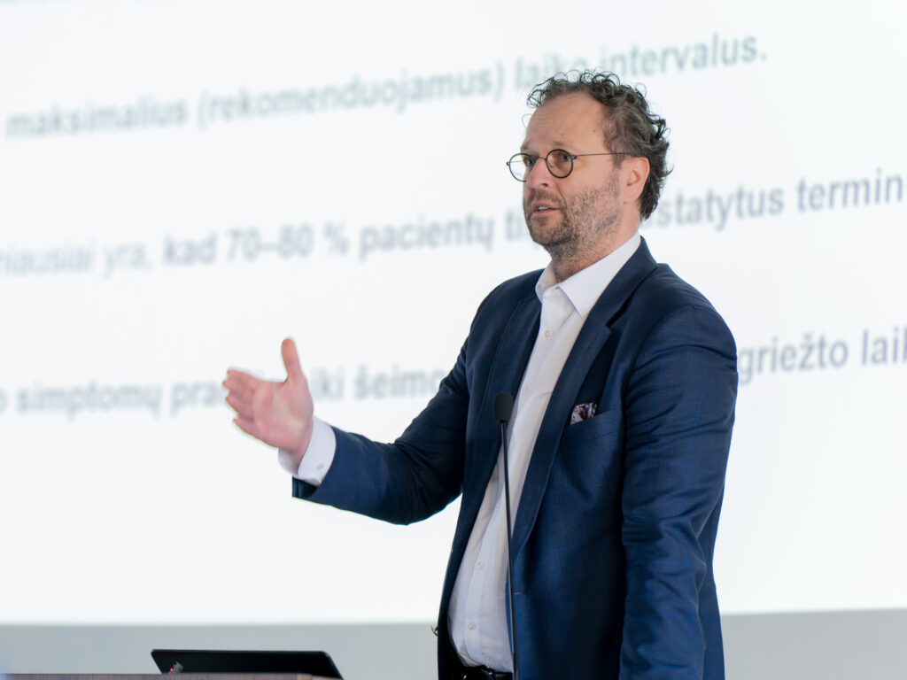 „Šiandien pirmą kartą susitikome regioniniame onkologijos renginyje, kad aptartume klausimus, susijusius su paciento keliu, kartu kurtume efektyvią onkologinės pagalbos sistemą. Tikimės, kad tai taps kasmetine tradicija – aptarti onkologinių pacientų problematiką, suprasti jūsų perspektyvą, pasidalinti, ką nuveikėme. Yra vienas labai svarbus paciento kelio elementas – paciento grįžimas namo. Šis mūsų susitikimas taip pat susijęs su paciento grįžimu namo: tai reiškia, kad dalis paslaugų gali būti suteikta arčiau namų, kad pacientas galėtų dirbti, gyventi savo socialinį gyvenimą. Be jūsų mes to nepadarysime. Tą įgyvendinti galime tik kartu bendradarbiaudami,“ – kolegas iš regionų sveikino Nacionalinio vėžio centro direktorius doc. dr. Valdas Pečeliūnas.