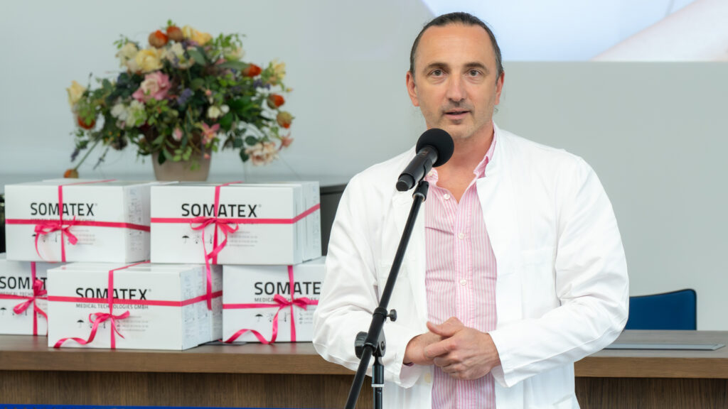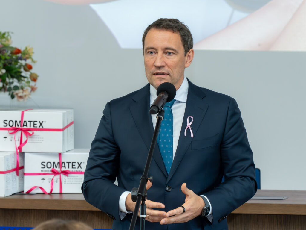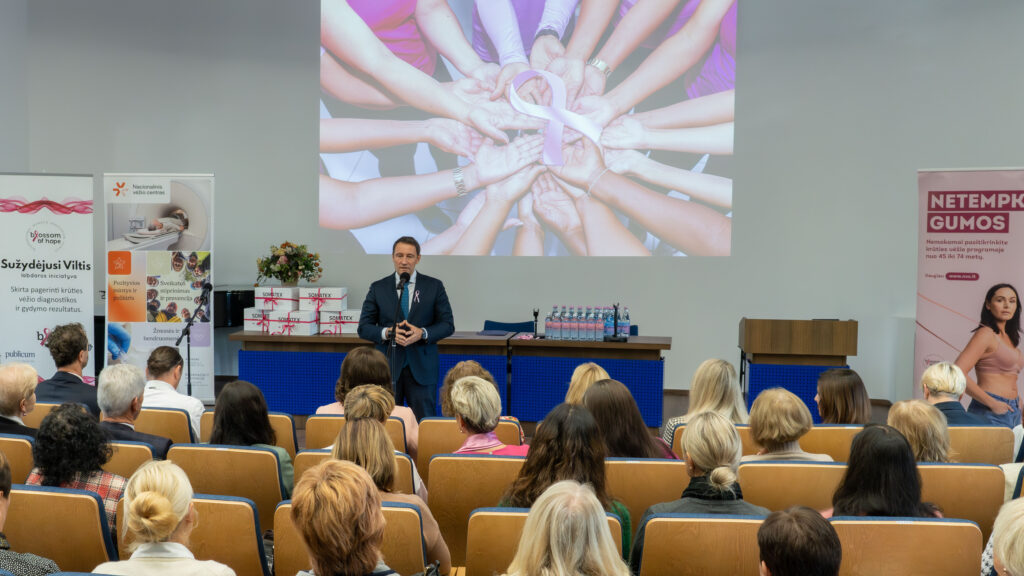 NVC Diagnostinės ir intervencinės radiologijos skyriaus vedėjas dr. Mantas Trakymas, sveikindamas profilaktinei patikrai iš Kupiškio, Alytaus ir Vilniaus rajono atvykusias moteris, pabrėžė, jog jūs esate visos sveikos moterys. „Jūs atvykote į pirmąją instanciją. Kodėl? Todėl, kad jūs atėjote pasitikrinti. Norint išgelbėti moteris nuo krūties vėžio, tikrai reikia tikrinti jus, kol esate sveikos. Būtina surasti tuos pakitimus, kurie yra mikroninio dydžio. Šiuos žymeklius, kuriuos gavome šiandien dovanų iš mūsų patikimo partnerio IWAVilnius, mes implantuojame būtent tada, kai randame mikroninius pakitimus. Kai nustatomas didelis navikas, jis apčiuopiamas, aiškiai matomas visais kitais tyrimo būdais. Siekdami kuo anksčiau diagnozuoti ligą, turime tikslą pamatyti mikronaviką ir pažymėti šiais žymekiais, kad navikas būtų matomas bet kada – tiriant ultragarsu, atlikus mamografiją, magnetinio rezonanso tyrime. Net tais atvejais, kai atlikus biopsiją, paties naviko nebematome, žymekliai visada padės matyti tą vietą, kur buvo navikas“, – sakė dr. Mantas Trakymas.