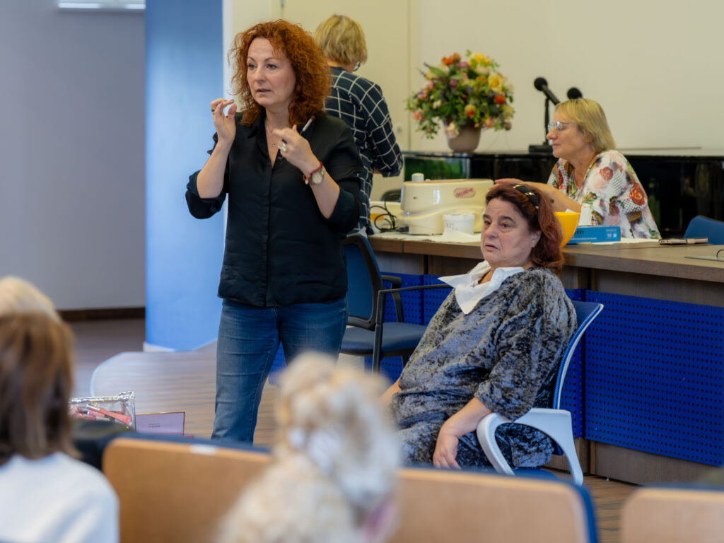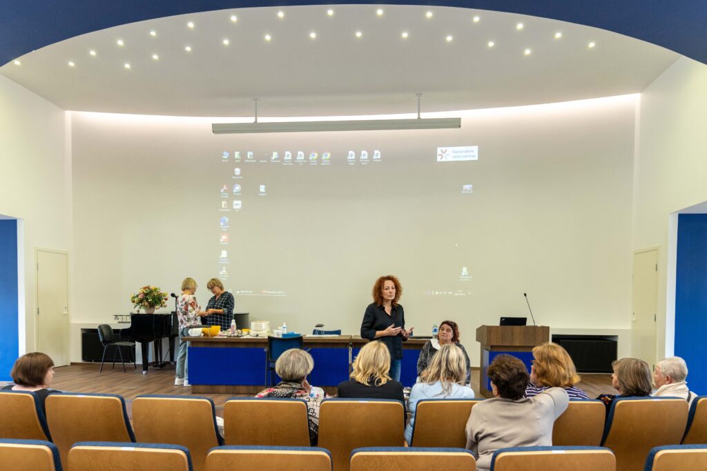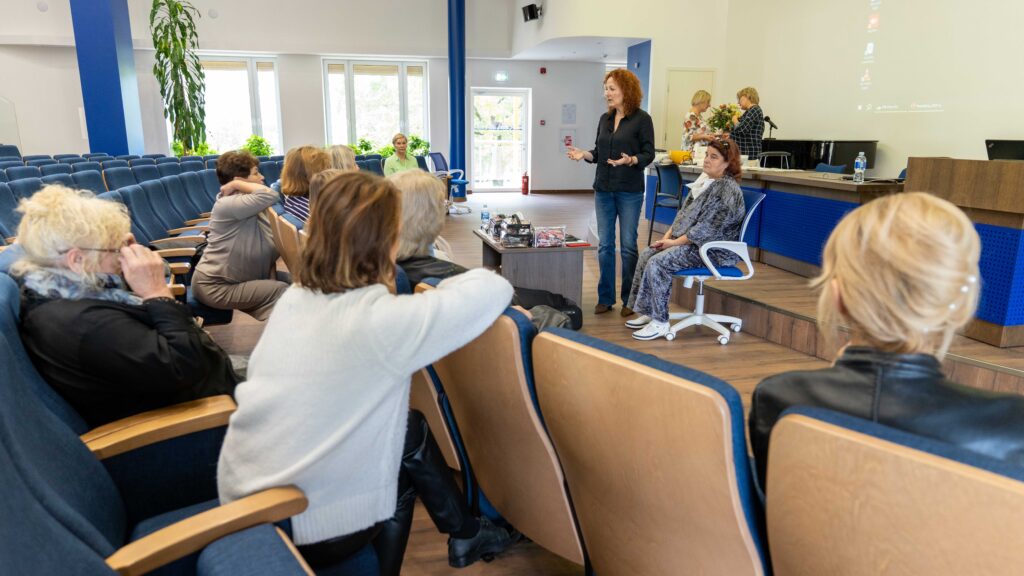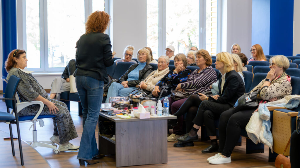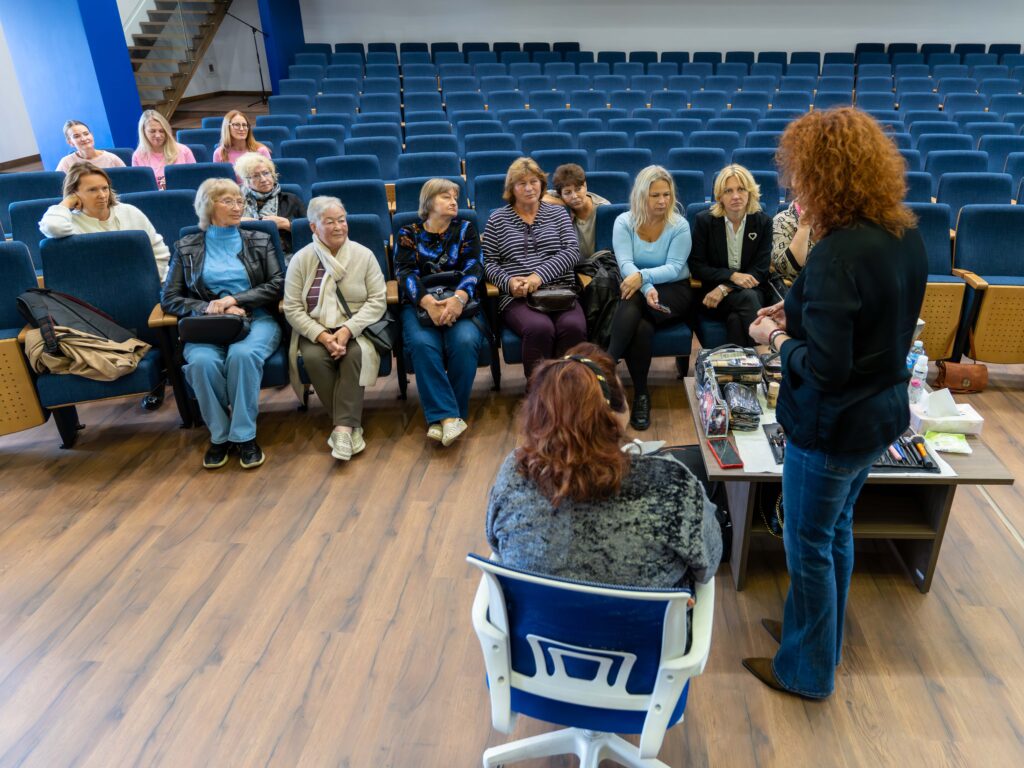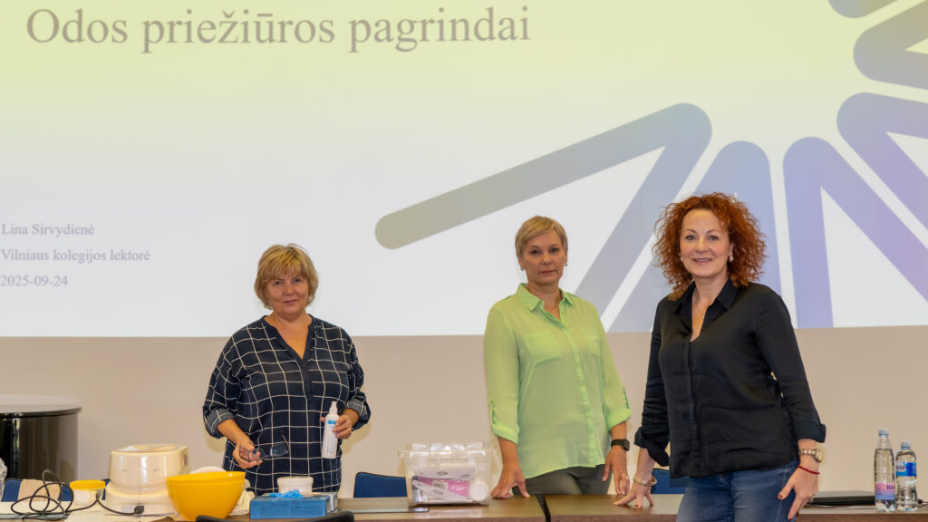 Didžiojoje prof. Kazimiero Pelčaro salėje elektrėniškes edukacijai pakvietė Vilniaus kolegijos Sveikatos priežiūros fakulteto lektorės Vaida Navickaitė Šakėnienė, Lina Sirvydienė. Kalbėtasi apie odos priežiūros pagrindus, specialistės demonstravo kaip pasidaryti makijažą, kokie būdai labiausiai tinka rankų priežiūrai.