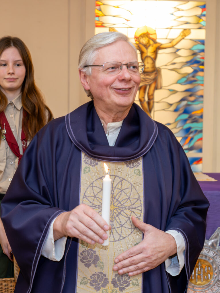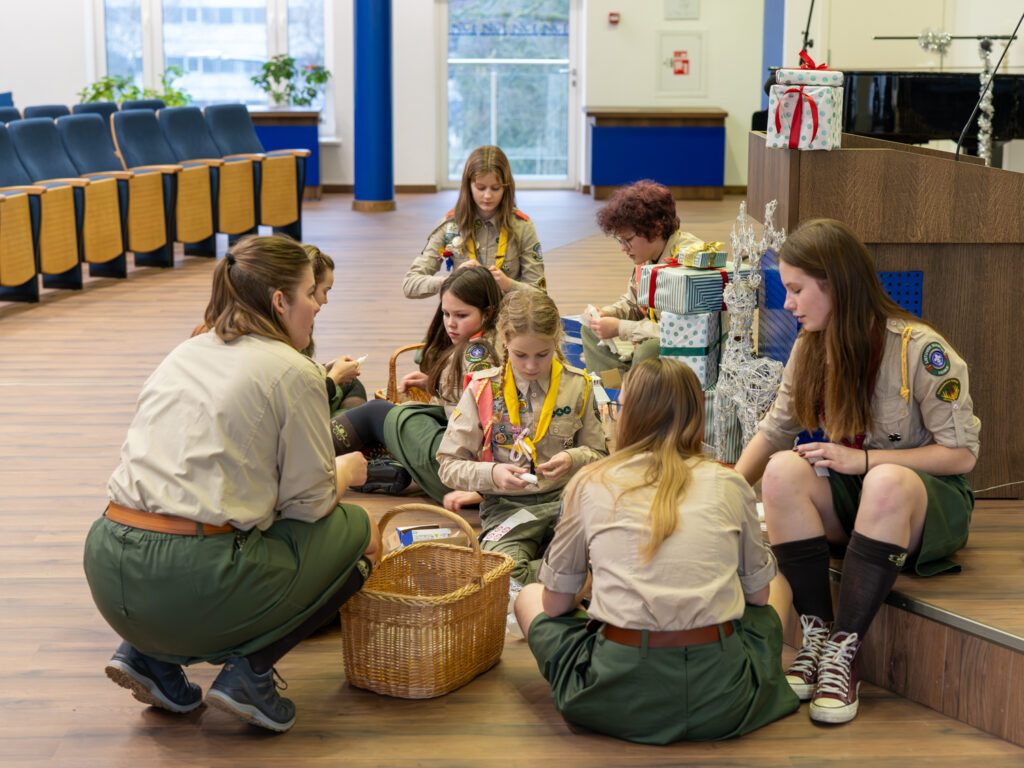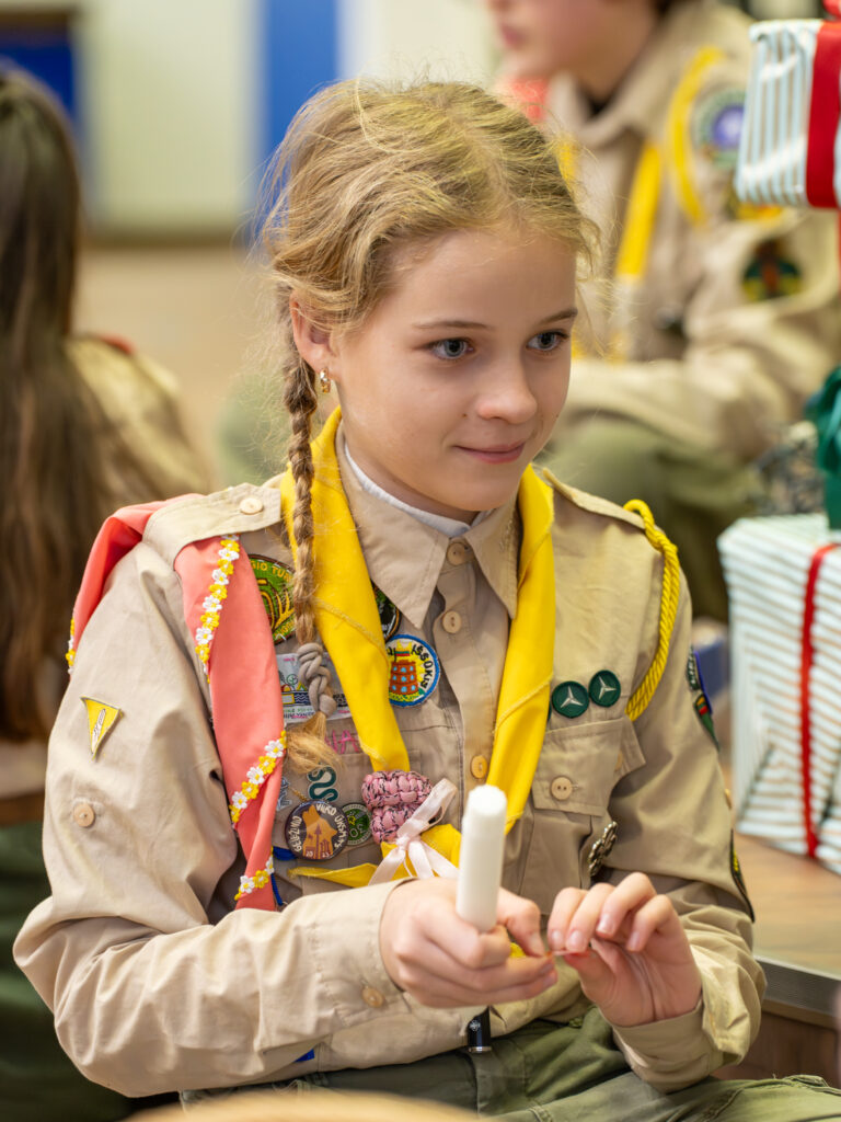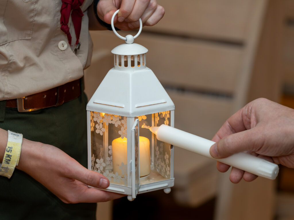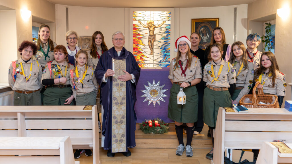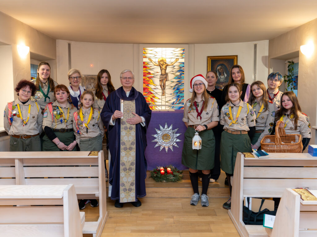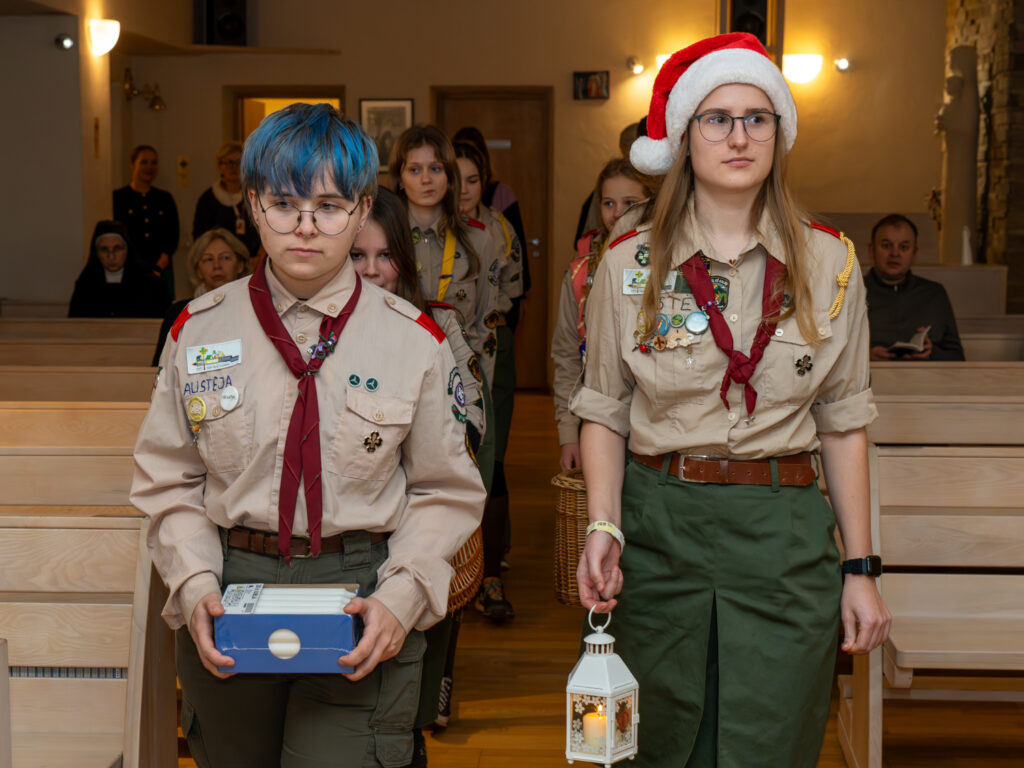 Gausus būrys jaunųjų Šventaragio tunto skautų Betliejaus taikos ugnies akciją pradėjo NVC koplyčioje, kur kapelionas Gintaras Petronis bei susirinkę į šv. Mišias žmonės prisidegė savo žvakes.