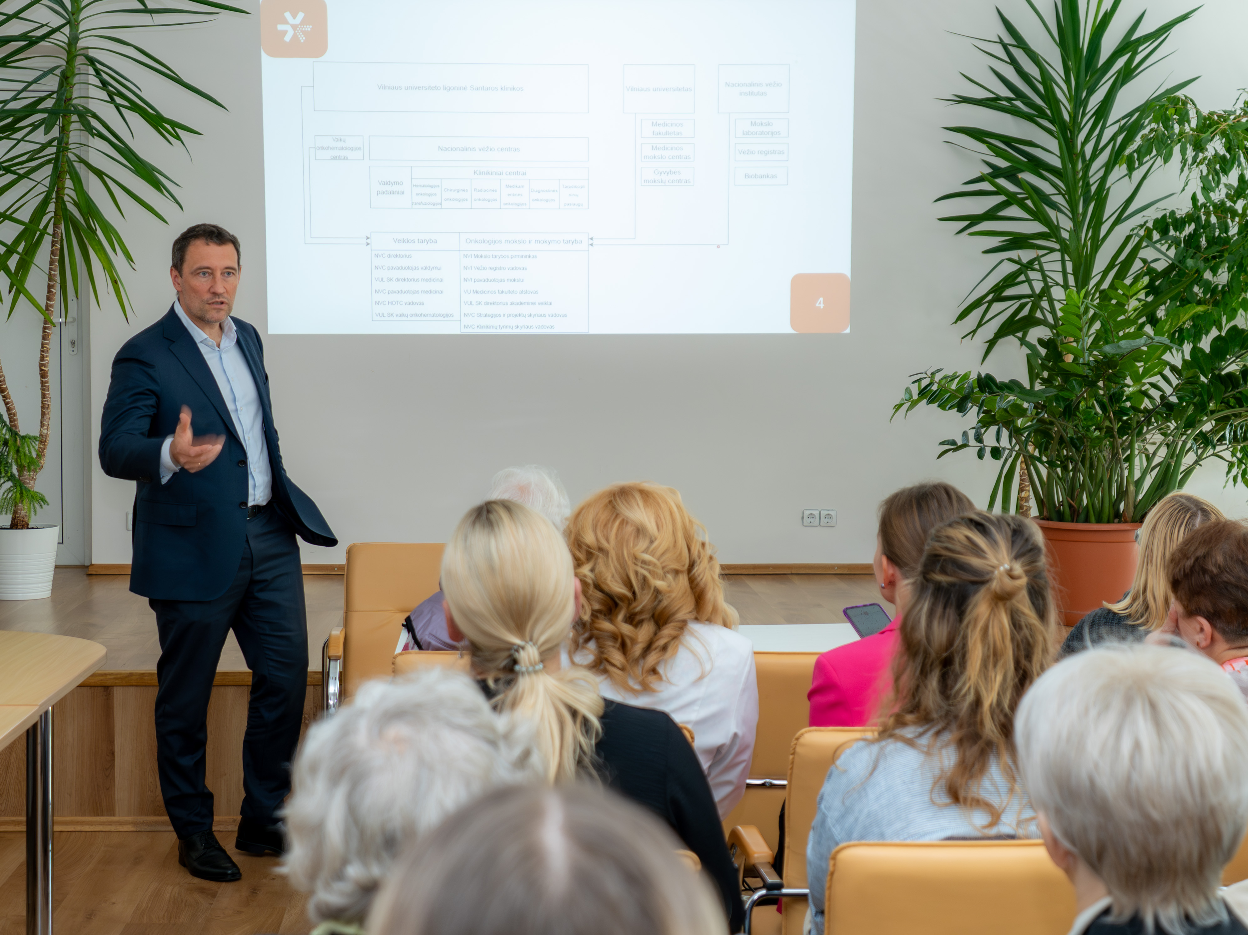 Kalbant apie Vilnių, šiemet čia įvyko dviejų didelių įstaigų konsolidacija. Nacionalinio vėžio instituto klinikinė veikla perduota Vilniaus universiteto ligoninės Santaros klinikoms. Taip sukurtas Nacionalinis vėžio centras – VUL SK autonominis filialas. Čia sutelktos visos klinikinės paslaugos – dirbam, kad mūsų pacientams būtų patogu,“ – kalbėjo doc. dr. V. Pečeliūnas.