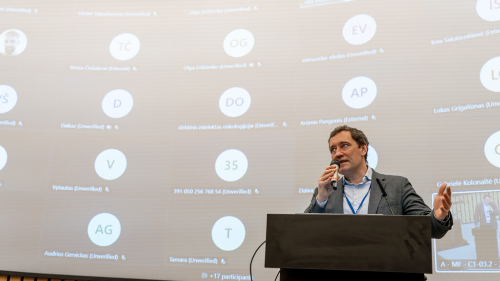 Medicinoje dirbtinio intelekto modeliai jau naudojami, pastaruoju metu jie ateina į naujas sritis. Šiuo metu lūkesčiai ir supratimas dėl dirbtinio intelekto panaudojimo pradeda sutapti ir atsiradus bendram matymui iš esmės galvojama, kaip išnaudoti naujas galimybes. Ši konferencija – viena iš galimybių aptarti, ką mes turime padarę, išbandę ir kur tie didieji iššūkiai ir didžiosios galimybės“, – pasakė doc. dr. Valdas Pečeliūnas, atidarydamas konferenciją.